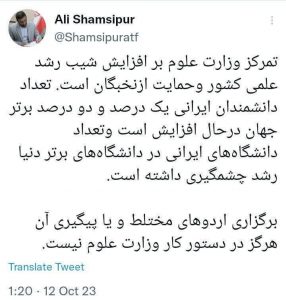 دکتر علی شمسی پور سخنگوی وزارت علوم، در توئیتی اعلام کرد: تمرکز وزارت علوم بر افزایش شیب رشد علمی کشور و حمایت ازنخبگان است.